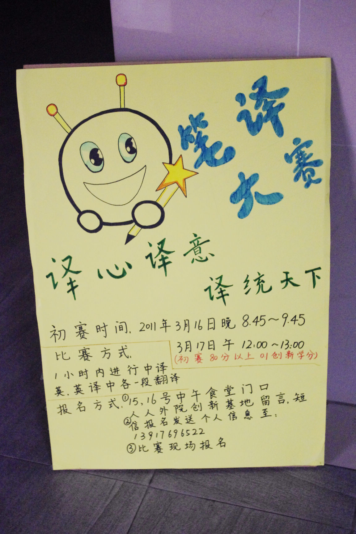 该活动的口号为:“译心译意,译统天下”,活动旨在考量华理学生的笔头翻译能力,比赛形式是在1小时内进行中译英和英译中各一段文章的翻译。