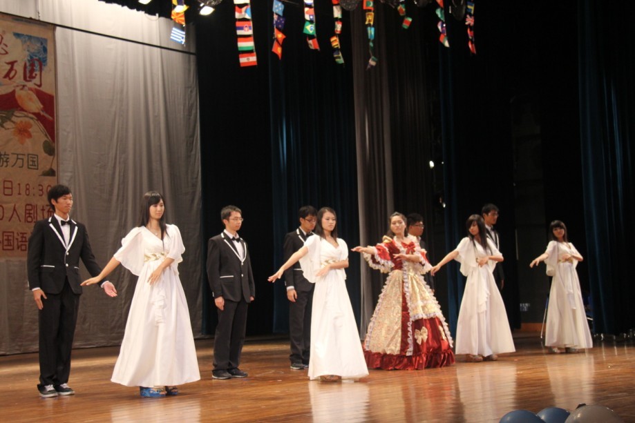 在颁奖环节之后,英语111班为大家奉献了一出充满奇幻色彩的舞台剧《歌剧魅影》,逼真的表演令观众们徘徊于现实与虚幻之间。随后,德语112班热情火辣的草裙舞,英语114悠扬舒缓的印度舞,两首风格迥异的舞曲在晚会中独树一帜,别具风情,令现场的同学们徜徉于美妙的舞蹈海洋。日语112班的话剧《范进中举》引得台下欢笑声一片。看到新生们给力的表演,外院教师也情不自禁,纷纷上台“过把瘾”。 何天雄、裴文波老师的歌曲和京剧表演充分展示了老师多才多艺的另一面,黄玉红和三村老师的对唱以及德语外教Alex的倾情献唱更是将晚会推向了高潮。最后,这一场精彩的视觉盛宴在德语111班所带来的动作整齐划一的苏格兰集体舞中华丽地落下了帷幕。