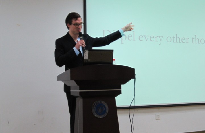 晚7时,颜静兰老师为本次外语节致开幕词,她指出外语节是同学们展示个人风采、提高英语技能、感受英语魅力的良好机会,希望同学们积极投入到本次外语节的活动中。最后,颜老师预祝本次外语节取得圆满成功,同时希望同学们在接下来的一系列外语节比赛中能有精彩的表现。随后,来自上海中学的英语外教Carter先生作了题为《English Study Strategy and English Reading Skill》的演讲,他与同学们就英语阅读能力及学习策略作了研讨与交流,Carter先生反复强调“快乐阅读”与“思考阅读”。在谈到如何享受阅读本身带来的乐趣时,Carter老师以一首诗歌为例,从其内容、语调变化方面进行赏析,体现出文字本身具有的美。他还深入分析了不同的学习动机,在了解到同学们的阅读习惯后,对其外语学习提出指导性建议。他精彩生动的演讲让台下的同学们听得目不转睛。