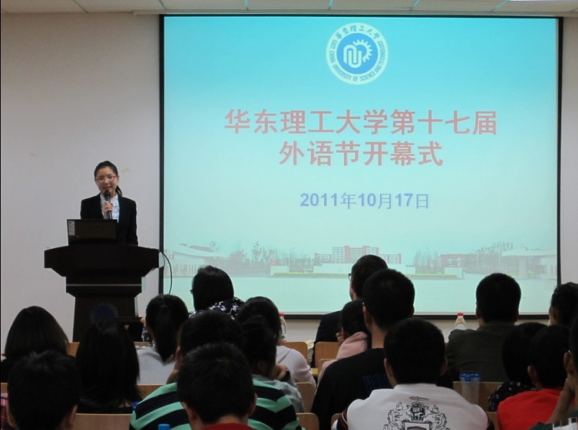 10月17日晚,华东理工大学第17届外语节开幕式暨外教系列讲座在大活321举行。本次外语节以“建华理优良学风,创外院语言氛围”为主题,旨在全面加强学风建设,丰富学生第二课堂,营造浓郁的外语语言学习氛围,通过开展外语配音、歌曲、短剧、演讲比赛等活动,激发学生外语学习的兴趣,培养学生的外语实际运用能力,提高大学生的综合素质和竞争能力。外国语学院副院长颜静兰、党总支副书记张攀、上海中学外教Ryan Carter以及各年级辅导员等领导和嘉宾出席了本次活动。