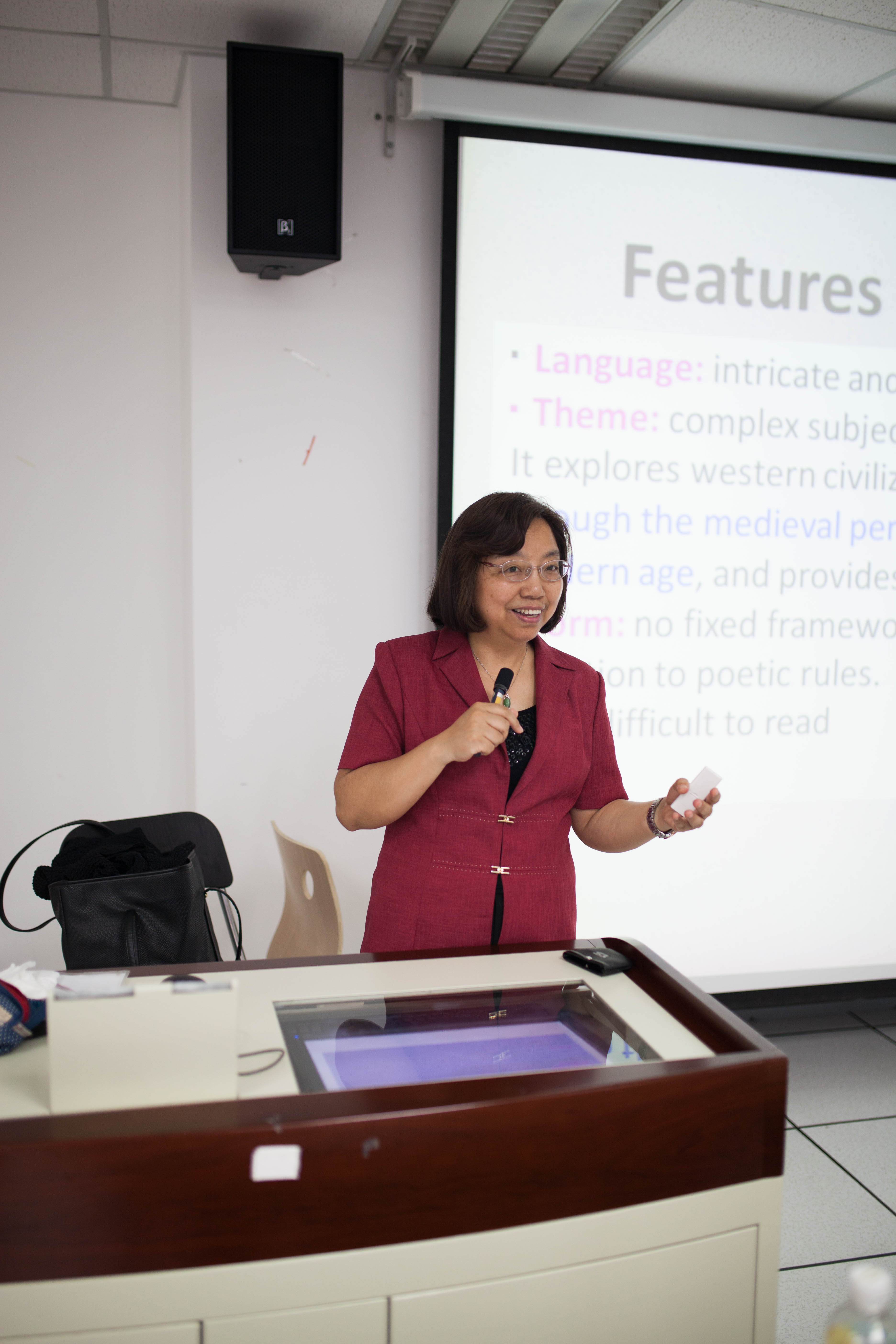 颜静兰教授分别介绍了庞德的生平、作品,以及他对中国古典文学的研究与翻译等几方面,通过详细具体的实例分析,生动形象地将庞德的一生展现在学生面前。颜教授言语幽默而不乏条理,抑扬顿挫且激情澎湃,引得学生一致好评。最后在颜教授的带领下,师生一起诵读庞德翻译的李白的《长干行》,书声琅琅,不绝于耳。