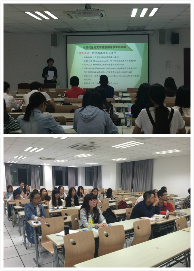 10月22日晚,外国语学院英美文学科研团队进奉贤系列讲座之一——“澳大利亚现代主义文学”讲座在奉贤外语楼401室开讲,王慧副教授担任本次讲座的主讲,来自三个年级、不同专业的同学到场聆听。