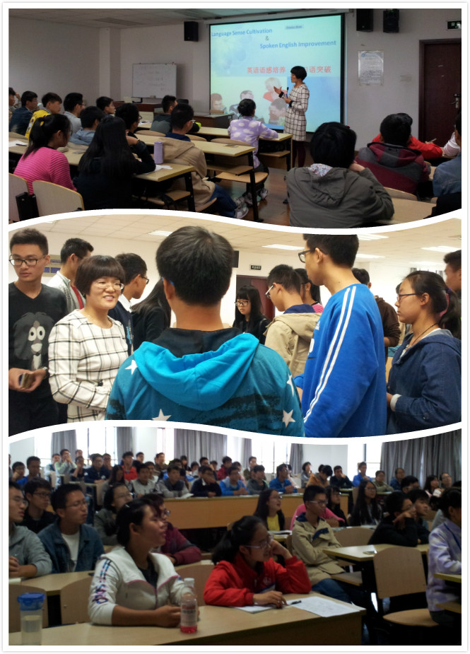 史老师根据多年教学经验,从中国英语学习者常犯的语音发音错误入手,由浅入深,从易到难,从发音、语调、重读、意群等方面,用丰富、典型的例子讲述了英语语言的特点。史老师亲身示范同学们常犯的错误发音,引来全场阵阵笑声;她清晰、准确的发音示范,引来全场的跟读和模仿。史老师还介绍了肢体语言、语感培养、对外交流等口语技巧,通过观看视频材料,分析视频中演讲者的特点,以及现场模拟互动,讲解了如何练就一口流利、地道的英语,如何用英语进行跨文化交流。