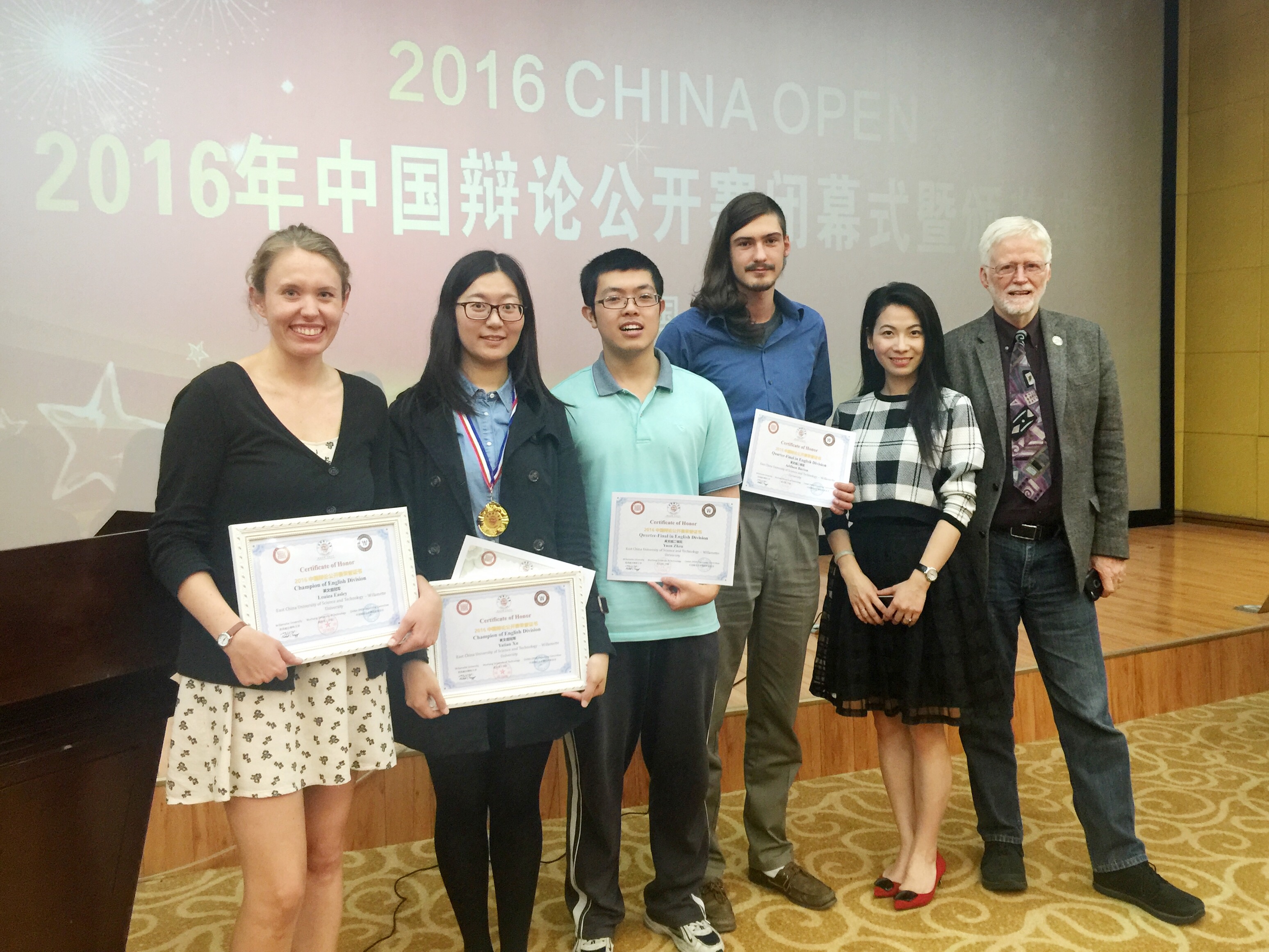 5月20-22日,第七届中国辩论公开赛在武昌理工学院举行。我校外国语学院英语系徐雅恬(英133班)和袁湛(英134班)2位选手分别与来自美国威廉姆特大学的辩手组队,最终,徐雅恬与美方Louisa Easley荣获全国冠军,袁湛与美方Addison Barton进入1/4决赛,获得二等奖。我校参赛队指导教师为英语系高攀。
