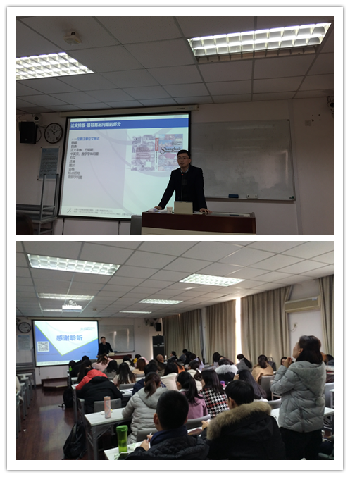 12月8日下午,应外国语学院邀请,上海文化贸易语言服务基地总经理毛隽博士,在六教207室作“关于撰写翻译硕士专业学位案例分析报告”的专题讲座。外国语学院副院长张正军(主持工作)、赵宏、部分导师以及全体翻译硕士研究生参与本次讲座。导师组组长王建国教授主持讲座。