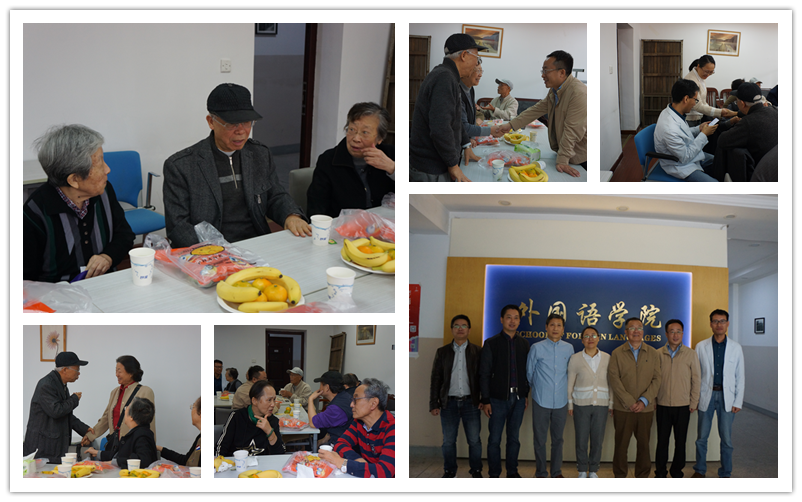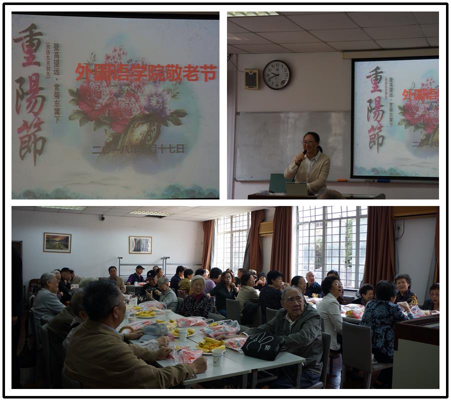 10月17日恰逢重阳节,外国语学院47名离退休教师欢聚六教107室,参加学院组织的“敬老节”返校活动。外国语学院党总支书记王喆,副书记樊俊,副院长吴建伟、赵宏和院长助理郑国锋等学院领导到场与离退休老教师共度佳节。学院党务秘书戚蕊主持活动。