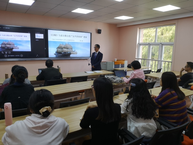 10月29日,应我院邀请,宁波大学段波教授在三教311室作题为“《白鲸》与麦尔维尔的‘太平洋帝国’想象”的学术讲座。讲座以线上线下同步的方式进行。党委副书记、院长赵宏主持讲座。