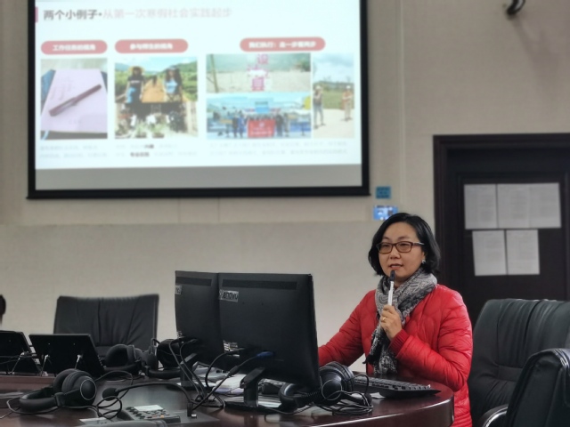 12月4日下午,我校艺术设计与传媒学院林轶南和王珊来我院分享了实践金课与项目建设的经验。本次活动由外国语学院院长赵宏主持,学院教师及辅导员出席。