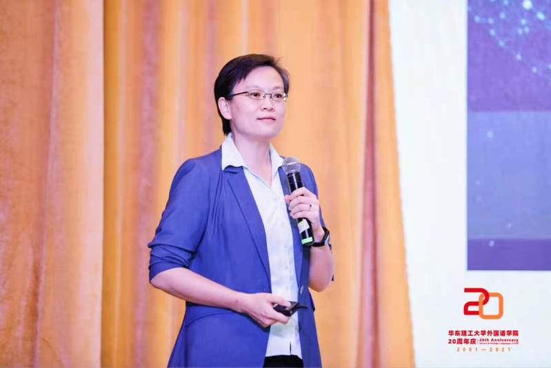 外国语学院院长赵宏代表学院作发展报告。赵宏代表外国语学院对现场、云端的嘉宾、同仁以及长期以来关心和支持学院发展的各界同仁和朋友表示了感谢,全面回顾了学院20年来的发展历程,介绍了学院取得的成绩,并对学院未来进行了展望。