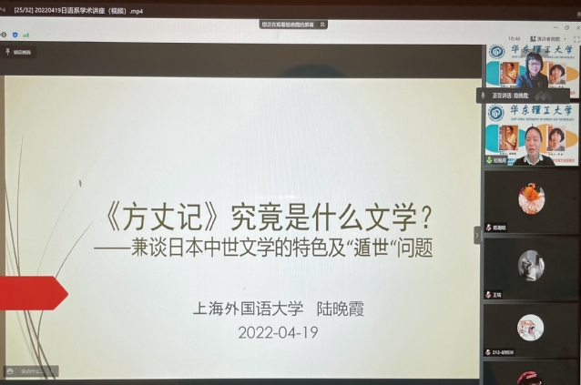 4月19日,上海外国语大学陆晚霞教授应邀为我院师生作了题为“《方丈记》究竟是什么文学?——兼谈日本中世文学的特色及‘遁世’问题”的学术报告。