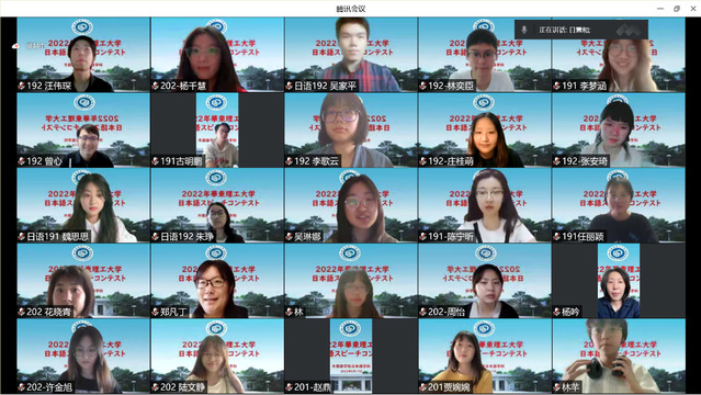 5月17日,外国语学院日语系线上举办“2022年度日语演讲比赛”。本次比赛面向日语系大三年级全体学生,由日语系主任梁海燕,副主任陈雪,教师黄育红、虞崖暖、杨吟、日置和、张凤云、陈雪、蒋青、郑凡丁、陈湘明以及亦野博教授(毕业于东京大学,樱美林大学日语教育硕士,曾任重庆大学和燕山大学日语教师)和早坂真由美老师(现任东京日语学校教务主任)担任评委。
