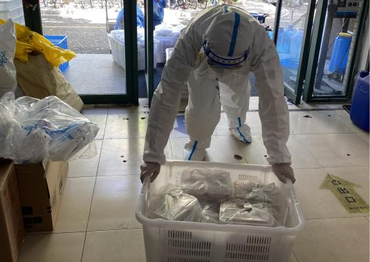 在疫情防控最吃劲的时刻,为减少师生接触,赵庆新身穿“大白”,将一箱箱饭菜稳稳送到宿舍楼内,虽然汗流浃背,但一想到能够保障同学们的安全,他的身上总是有使不完的力气。