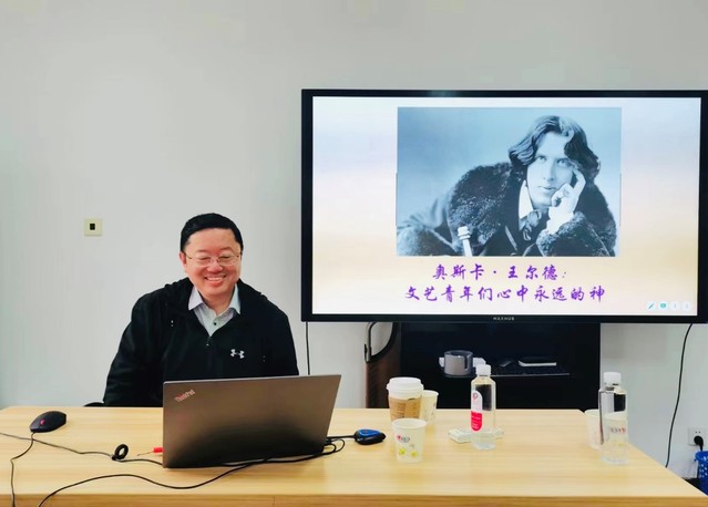 2023年4月4日,在我校徐汇校区3教208教室,上海外国语大学高翻学院副院长吴刚教授应外国语学院邀请作题目为《王尔德---文艺青年心中永远的神》讲座。本次讲座采用线上和线下相结合的方式举行,由外国语学院大学英语教学部金春岚副教授主持。