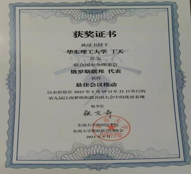 4月30日,丁天同学代表我校应邀参加南京大学模拟联合国大会,与来自南京大学、上海外国语大学、南京外国语学校等四十所高校及高中的近百名主席、代表、观察员共同参与,并通过出色的表现获得“最佳外交风采奖”。