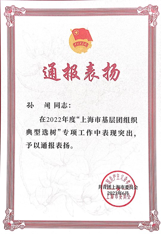 近日,共青团上海市委对上海市基层团组织先进集体和个人发布通报表扬。我院团委入选2022年度“上海市基层团组织典型选树”专项工作团委选树名单;我院团委书记孙阔入选2022年度“上海市基层团组织典型选树”专项工作个人选树名单。