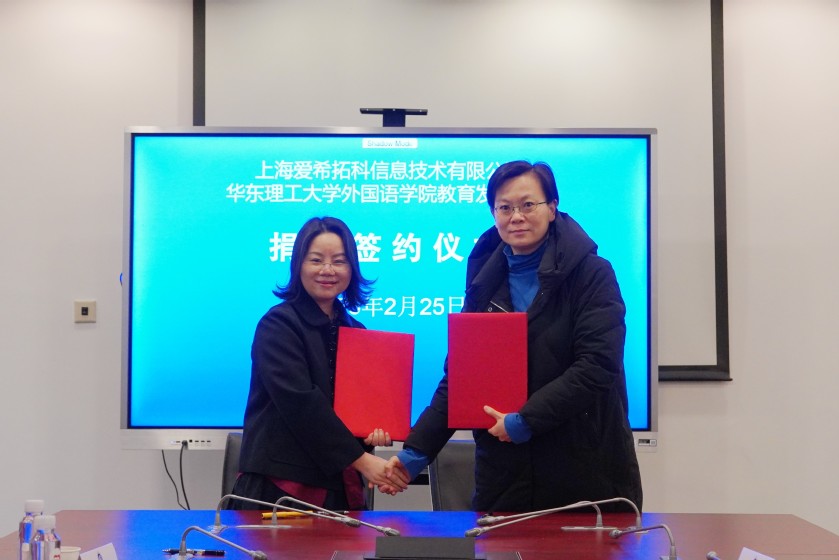2月25日,上海爱希拓科信息技术有限公司与我校外国语学院举行捐赠签约仪式。上海爱希拓科信息技术有限公司上海公司总经理许英姿、东京公司总经理周天广、技术经理翁明伟、生产管理顾问周子豪,外国语学院党委书记王喆、院长赵宏、副院长韦晓保出席签约仪式。仪式由外国语学院党委副书记樊俊主持。